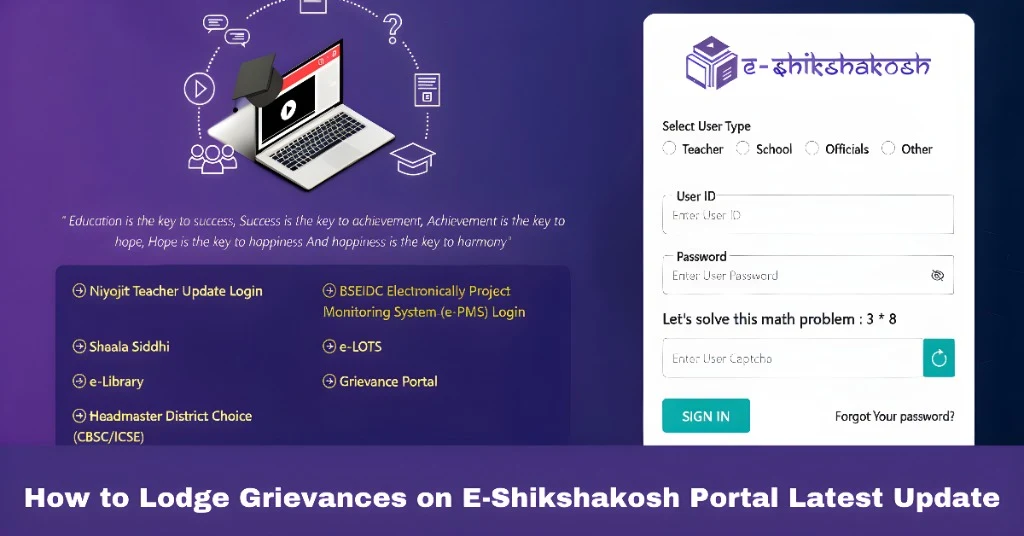 Lodging a grievance on the E-Shikshakosh portal is a simple and effective way to resolve issues related to the portal’s services. Whether it’s a technical problem, a salary discrepancy, or any other concern, the grievance section helps streamline the process and ensures that your concern reaches the right authorities. Follow the steps outlined above, and you’ll be on your way to getting your issues addressed efficiently.